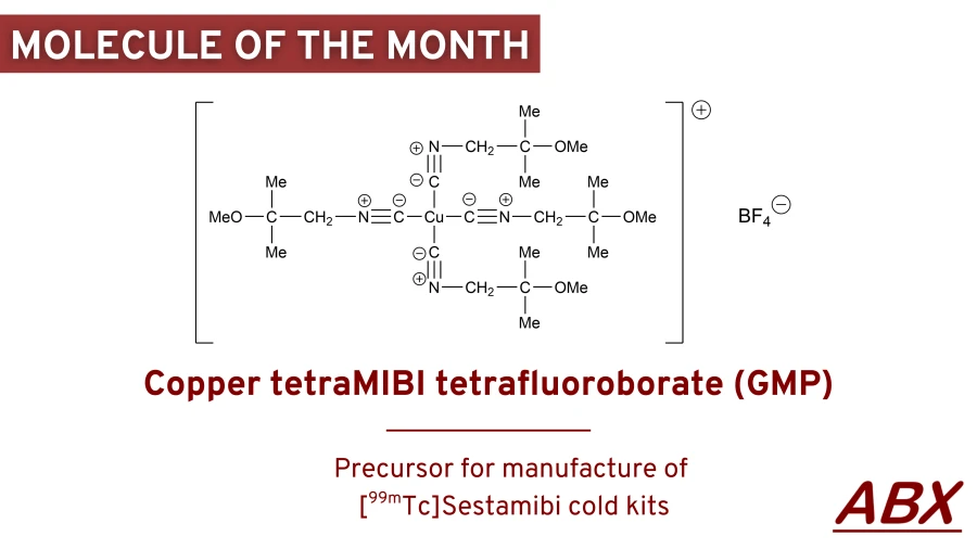 [99mTc]Sestamibi [1] ist ein Myokardperfusionskontrastmittel zur Darstellung des Blutflusses durch das Herz. Es wird auch zur Diagnose von primärem Hyperparathyreoidismus zur Identifizierung von Nebenschilddrüsenadenomen, in der radioaktiven Chirurgie der Nebenschilddrüse und in der Diagnose von Brustkrebs eingesetzt [2]. ABX liefert den GMP-Präkuros KupfertetraMIBI-Tetrafluorborat für die Herstellung von [99mTc]Sestamibi-Cold-Kits, die in bestimmten Ländern zugelassen sind. Die Analysemethoden und der Herstellungsprozess des Vorläufers sind vollständig validiert.