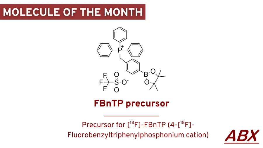 Das 4-[18F]-Fluorbenzyltriphenylphosphonium-Kation ([18F]-FBnTP) ist eine positiv geladene, lipophile Verbindung, die als negativer Membranpotential-gerichteter PET-Tracer für die Myokard-Perfusionsbildgebung (MPI) verwendet wird [2]. Der Precursor (ABX Prod.-Nr. 7058) zur Herstellung von [18F]FBnTP über eine kupfervermittelte Ein-Schritt-18F-Fluorierungsreaktion sowie die entsprechende Referenzverbindung (ABX Prod.-Nr. 7059) sind für Forschungs- und Entwicklungszwecke erhältlich.