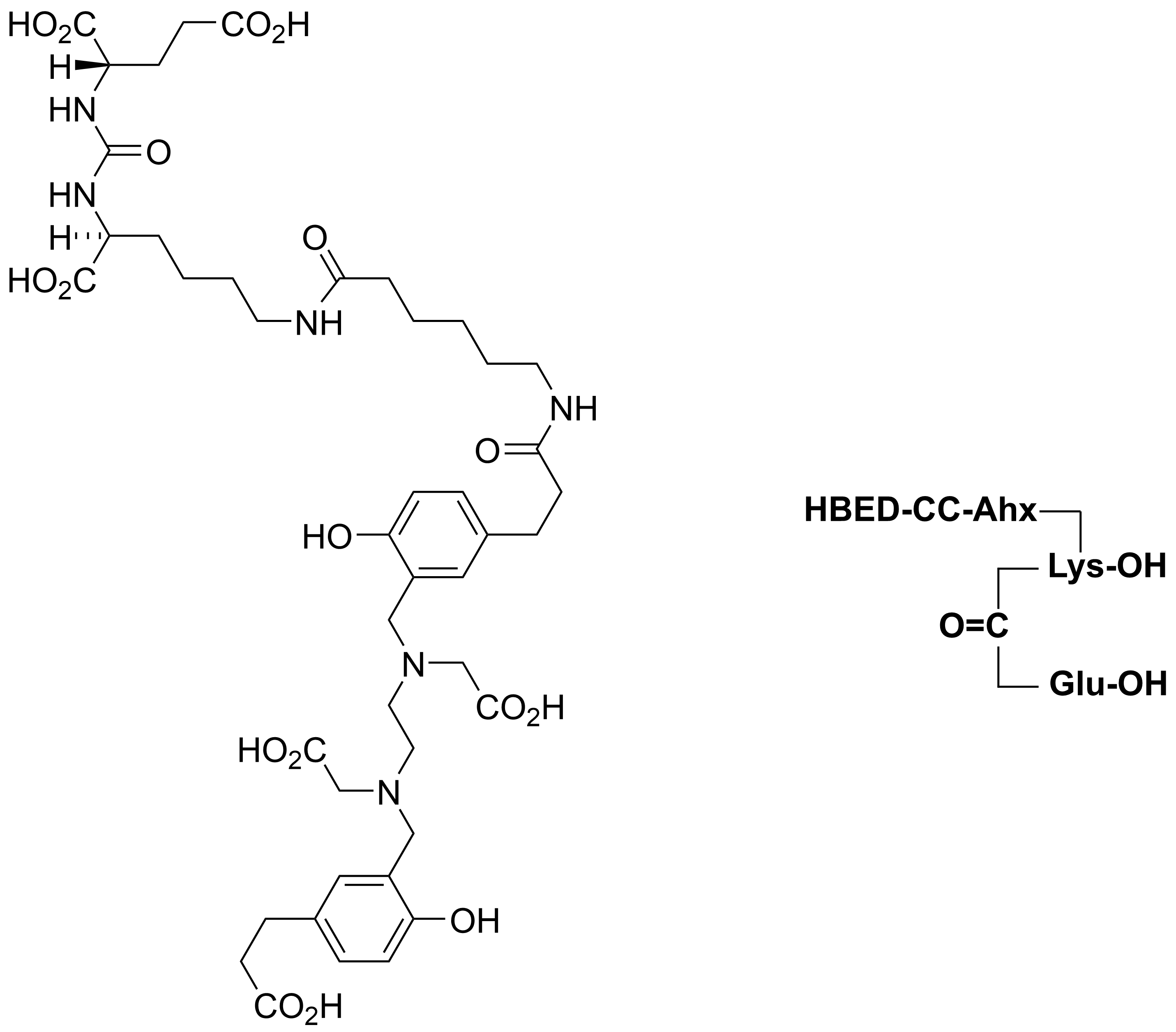 PSMAHBED; Glu-CO-Lys(Ahx)-HBED-CC; Glu-NH-CO-NH-Lys(Ahx)-HBED-CC; 2-[3-(1-Carboxy-5-{6-[3-(3-{[(2-{[5-(2-carboxy-ethyl)-2-hydroxy-benzyl]-carboxymethyl-amino}-ethyl)-carboxymethyl-amino]-methyl}-4-hydroxy-phenyl)-propionylamino]-hexanoylamino}-