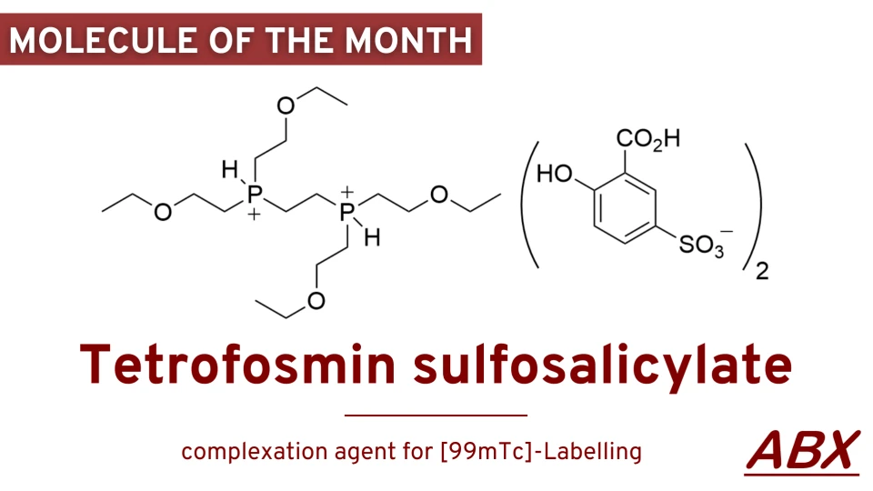99mTc-Tetrofosmin ist ein Mittel zur Myokardperfusionsbildgebung und wird seit Jahrzehnten weltweit unter dem Markennamen Myoview verwendet. Das Patent ist abgelaufen und ABX bietet nun Tetrofosmin-Sulfosalicylat an, das zur Herstellung von Kits für die 99mTc-Markierung verwendet werden kann. Im Gegensatz zum hochempfindlichen Tetrofosmin ist sein Salz Tetrofosmin-Sulfosalicylat stabil und kann ohne besondere Vorsichtsmaßnahmen verwendet werden.