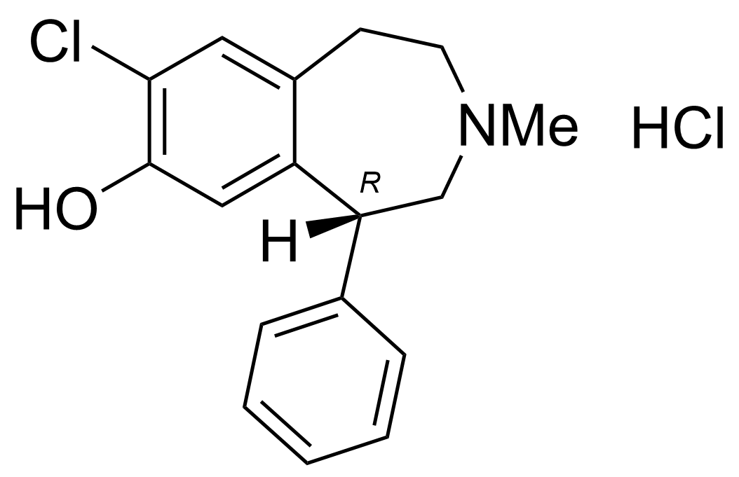 1H-3-Benzazepin-7-ol, 8-chloro-2,3,4,5-tetrahydro-3-methyl-5-phenyl-, hydrochloride, (5S)-; 8-Chloro-2,3,4,5-tetrahydro-3-methyl-5-phenyl-1H-3-benzazepin-7-ol, hydrochloride, (S); SCH 23388 hydrochloride; SCH23388 HCl; (S)-(–)-7-Chloro-8-hydroxy-3-methyl-1-phenyl-2,3,4,5-tetrahydro-1H-3-benzazepine, hydrochloride